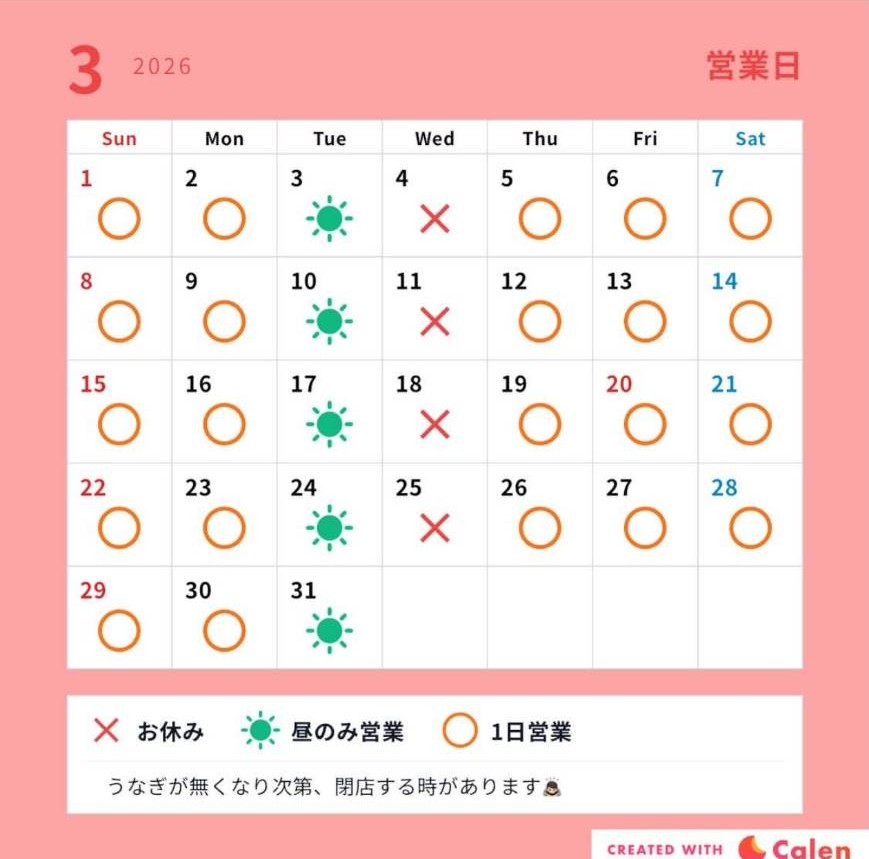※うなぎが無くなり次第、早めに閉店する場合がございます。